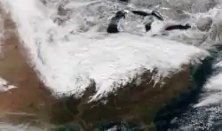 ![]() Satellite image of the blizzard near peak intensity at 06:45Z (1:45 a.m. EST) on January 27, 2015. | |