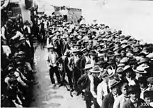 Before 1885, fewer and fewer Japanese people emigrated from Japan, in part because the Meiji government was reluctant to allow emigration, both because it lacked the political power to adequately protect Japanese emigrants, and because it believed that the presence of Japanese as unskilled laborers in foreign countries would hamper its ability to revise the unequal treaties. A notable exception to this trend was a group of 153 contract laborers who immigrated—without official passports—to Hawai'i and Guam in 1868.[89] A portion of this group stayed on after the expiration of the initial labor contract, forming the nucleus of the nikkei community in Hawai'i. In 1885, the Meiji government began to turn to officially sponsored emigration programs to alleviate pressure from overpopulation and the effects of the Matsukata deflation in rural areas. For the next decade, the government was closely involved in the selection and pre-departure instruction of emigrants. The Japanese government was keen on keeping Japanese emigrants well-mannered while abroad in order to show the West that Japan was a dignified society, worthy of respect. By the mid-1890s, immigration companies (imin-kaisha 移民会社), not sponsored by the government, began to dominate the process of recruiting emigrants, but government-sanctioned ideology continued to influence emigration patterns.[90]