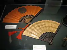 - a folding fan that has wood or metal ribs with lacquered paper attached to the ribs and a metal outer cover