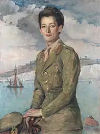 On 21 July 1941, she was appointed Director, Auxiliary Territorial Service. She was given the acting rank of chief controller (equivalent to major general), while holding the war substantive rank of senior commander (equivalent to major).[9] This made her the world's youngest general at that time.[2] One of her first actions as Director was to design a new, well fitting uniform for all ranks of the ATS.[10] On 21 July 1942, she was promoted to war substantive controller (equivalent to colonel) and made temporary chief controller.[11] She travelled to Canada in September 1942 to inspect the Canadian Women's Army Corps and assisted in its recruiting campaign.[12] She returned to the UK in November following the seven-week trip.[13] On 30 October 1943, she relinquished the appointment of Director, Auxiliary Territorial Service,[14] for health reasons.[15]