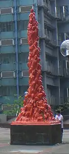 Pillar of Shame is a series of Galschiøt's sculptures. The first was erected in Hong Kong on 4 June 1997, ahead of the handover from British to Chinese rule on 1 July 1997, as a protest against China's crackdown of the Tiananmen Square protests of 1989. The Pillar of Shame is eight metres high and depicts twisted human bodies.[5] On 30 April 2008, the Pillar was painted orange[6] by Chinese democracy activists as part of the worldwide Color