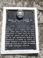 The construction of Jesús de la Peña Chapel marks the beginning of Christianity in Marikina. Before the Spaniards arrived, the area was settled by river-dwellers who relied on the Marikina River for their means of livelihood. When the Jesuits first came to the idyllic, fertile land now known as Jesús dela Peña, they brought with them a small image of Jesus. Fired with zeal to convert the natives to Catholicism, they held the first Mass in a former storage house on April 16, 1630. Afterwards, they immediately formed their order at the west bank of the river which was full of big rocks. Inspired by the site, the priests soon called the place as "Jesús de la Peña" (Jesus of the Rock) which was also the name of the new mission.[3]