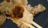 Guotie (Chinese: 鍋貼; pinyin: guōtiē; lit. 'pot stick') is pan-fried jiaozi, also known as potstickers (a direct character translation), or yaki-gyōza (焼き餃子, lit. “pan-fried jiaozi”) in Japan. They are a Northern Chinese style dumpling popular as a street food, appetizer, or side order in Chinese cuisine. This dish is sometimes served on a dim sum menu, but may be offered independently. The filling for this dish usually contains pork (sometimes chicken, or beef in Muslim areas), cabbage (or Chinese cabbage and sometimes spinach), scallions (spring or green onions), ginger, Chinese rice wine or cooking wine, and sesame seed oil.
