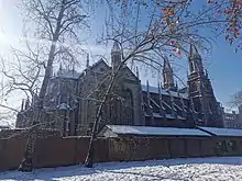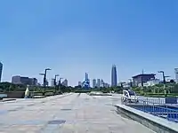 On May 27, 1966, the Cultural Revolution started in Jinan with an article in the local newspaper "Jinan Evening News" (济南晚报) that denounced vice-governor Yu Xiu as a Bourgeois agent within the government.[37] Starting from early June 1966, the schools in Jinan were closed down by strikes as teachers were "struggled against". At the same time, big-character posters started to appear in the city.[37] Red Guards took to the streets of Jinan from late August 1966 onwards, damaging cultural heritage and setting up courts to prosecute perceived enemies of the revolution. In the spring of 1967, the "May 7th Incident" took place: When Zhang Chunqiao and Yao Wenyuan, both later reviled as members of the Gang of Four, visited Jinan to support the Cultural Revolution and its local leader Wang Xiao Yu, fighting erupted in the front of the provincial government between two rival factions of the Cultural Revolution, the "April 22nd Group" and Wang Xiao Yu's "April 28th Group". In the end, more than 10,000 people had been involved in the fighting.[38] On October 11, 1967, the tallest statue of Mao Zedong in Shandong province was erected on the campus of Shandong Normal University.[39] On September 17, 1968, a large assembly of Jinan workers celebrated the arrival of a mango fruit in the "August 1st" Meeting Hall. The fruit had been a gift to the workers in Beijing by Mao and was subsequently passed on to the workers in Jinan. In November 1968, Wang Xiao Yu began to agitate against the local army units in Jinan and Shandong Province. By then unrest due to the Cultural Revolution had severely damaged the city's governmental and industrial infrastructure, with about 80 percent of all government institutions shut down.[40] Large public protests were staged on April 4 and 5, 1969, in which approximately 500,000 people protested the occupation of Zhenbao Island by the Soviet Union.[41] On July 29, 1970, the leadership of the Cultural Revolution passed a resolution to make sweeping changes to the city's educational system: The liberal arts departments of Shandong University were moved to Qufu and combined with Qufu Normal College to form a new Shandong University. The biology department was moved to Tai'an and merged into the Shandong Agricultural College. The rest of the sciences were to form the Shandong Science and Technology University. Shandong Normal University was to be moved to Liaocheng. Shandong Medical College and Shandong College of Traditional Chinese Medicine were to be merged and moved to Tai'an.[42] Shandong University was restored in its original form and the "Shandong Science and Technology University" was abolished in early 1974.[43] The first reversals of Cultural Revolution policies started in early 1971: On May 23 of that year, the Shandong Provincial Museum was reopened after having been closed for about 5 years (since May 1966).[44] In the next year, the Jinan Committee for the Cultural Revolution officially reverted the name changes of four city districts enacted in 1966. During the 6 years between the name change and its reversal, Lixia District had been known officially as "Hongwei", Tianqiao as "Face the Sun", Huaiyin as "East Wind", and Shizhong as "Red Flag".[45] As the Cultural Revolution came to an end, Jinan started to receive visitors from abroad. For example, it was visited by a delegation from the United States Congress between August 8 and 11, 1975.[46] On September 18, 1976, Mao's death was mourned by about 600,000 people at an official service in Jinan's August 1 Square.[47]