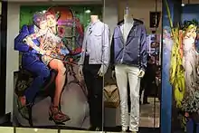 From September 17 to October 6, 2011, the Gucci store in Shinjuku hosted the Gucci x Hirohiko Araki x Spur "Rohan Kishibe Goes to Gucci" Exhibition, a collaboration between the luxury Italian clothing brand, Araki, and the Japanese fashion magazine Spur.[120] The exhibit celebrated the 90th anniversary of Gucci and featured a life-size figure of Rohan Kishibe, as well as numerous illustrations by Araki that included actual pieces of the brand's own 2011–2012 fall/winter collection and his own original fashion designs.[120] The October 2011 issue of Spur featured another one-shot manga titled Rohan Kishibe Goes to Gucci (岸辺露伴 グッチへ行く, Kishibe Rohan Guchi e Yuku), in which Rohan goes to a Gucci factory to discover the secret behind a magical handbag with the characters wearing and using Gucci products.[121][122] This was followed by another collaboration in the February 2013 issue of Spur with Jolyne, Fly High with Gucci (徐倫、GUCCIで飛ぶ, Jorīn, Gutchi de Tobu), starring Jolyne Cujoh from Part 6.[123][124] A free English translation of the latter was previously available on Gucci's Facebook page. Again, Araki's artwork was featured in Gucci's storefront displays around the world.[125][126]