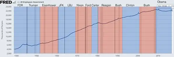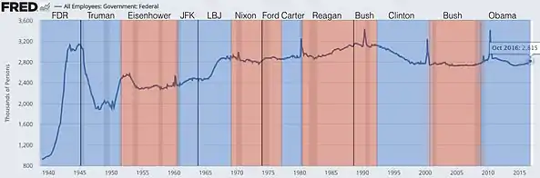 Numbers listed from 1941 and onward are BLS data[6] of nonfarm jobs (in thousands), and are shown from the year beginning and ending each presidential term. The monthly statistics are quoted from January, as U.S. presidents take office at the end of that month.