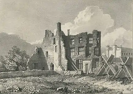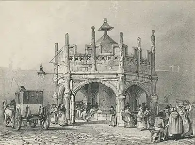 John Chubb's topographical work shows Bridgwater streets and buildings, and his portraits are of his family and local worthies. A number of the paintings feature pretty girls in ornate hats.[24] His portraits of tradesmen and craftsmen include their tools, rather like the Books of Trades of earlier centuries. There are more portraits than topographical paintings. Some time in the early C19 lithographic prints were made of about a dozen of his paintings of Bridgwater scenes, and these are fully represented in the Museum's collection. They were probably by his grandson, John Chubb the younger, also a talented artist. A letter (in the Chubb MS in the Somerset Record Office) which he wrote to his father, Morley, in 1835, mentions him having drawings reproduced as prints by Charles Joseph Hullmandel, the foremost lithographic printer of the time.