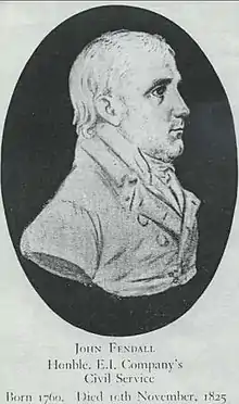 Fendall was born on 9 October 1762 in St Andrew Holburn, London.[1] He began service in the East India Company in 1778 at the age of 16. In 1790 he was Collector of Midnapur and had attained the status of Senior Merchant. He returned to London in 1809 for the first time in 31 years. The voyage at that time took 5 ½ months to complete.