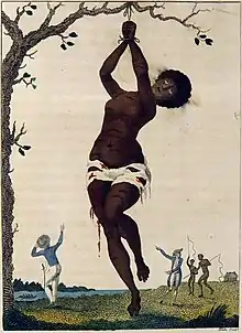 ![]() John Gabriel Stedman stands over a slave after the capture of Gado Saby, a village of Maroon (people) in Surinam, from the frontispiece of his Narrative | |