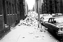 That same year, 1968, also saw a three-day Broadway strike and a nine-day sanitation strike.[16] Quality of life in the city reached a nadir during the sanitation strike as mounds of garbage caught fire and strong winds blew the filth through the streets.[17] In June 1968, the New York City Police Department deployed snipers to protect Lindsay during a public ceremony, shortly after they detained a knife-wielding man who had demanded to meet the mayor.[18] With the schools shut down, police engaged in a slowdown, firefighters threatening job actions, the city awash in garbage, and racial and religious tensions breaking to the surface, Lindsay later called the last six months of 1968 "the worst of my public life."[1]
