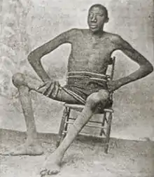 John Rogan was born in Hendersonville, Tennessee, on February 16, 1868. He was the son of the former slave William Rogan, as the fourth of twelve children. John began to grow very rapidly at the age of 13, due to gigantism.[1] This led to ankylosis[2] (abnormal rigidity of the skeletal joints). By 1882, he could not stand or walk.