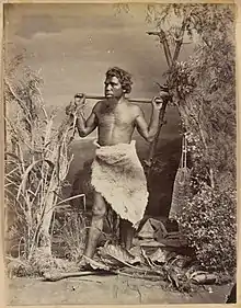 Lindt's staged studio spectacles of indigenous people are now regarded as exemplifying a colonial attitude that the Australian aborigine was an inferior, dying race whose inevitable vanishment was a romantic curiosity that warranted a photographic record.[9][52][53] In the field, in New Guinea, his marketable imagery of the 'mysterious shores of Papua and their savage inhabitants'[54] were posed, by subjects bribed or coerced to do so, against suitably picturesque backgrounds chosen by Lindt, and thus are no more accurate as ethnographic records than his studio tableaux,[55] and are loaded with romance and prejudice derived from his reading of British accounts and diaries of colonialists' adventures in Africa.[56]