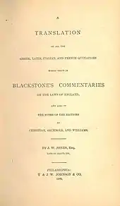 - J[ohn] W[inter] Jones (1889), A Translation of All the Greek, Latin, Italian and French Quotations which Occur in Blackstone's Commentaries on the Laws of England; and also in the Notes of the Editions by Christian, Archbold, and Williams, Philadelphia, Penn.: J. W. Johnson & Co., OCLC 58547017