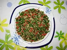 | Tabbouleh (تبولة) | A salad of finely chopped parsley and mint turned with bulgur, tomatoes, onion and seasoned with olive oil and lemon juice. |