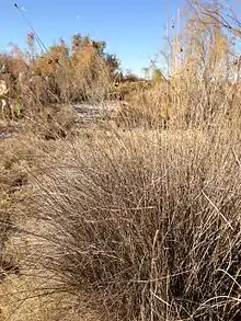 Juncus cooperi is a species of rush known by the common name Cooper's rush. It is native to the deserts of the southwestern United States and northern Mexico, where it grows in alkaline and saline soils such as those around salt marshes and desert springs. This is a perennial herb forming large clumps of erect stems up to about 80 centimeters tall from a thick rhizome and large root network. The bases of the stems are surrounded by sparse, small leaves, which are stiff and have sharp tips. The inflorescence is a cluster of brown, pale green, or straw-colored flowers accompanied by one bract which appears as an extension of the stem.