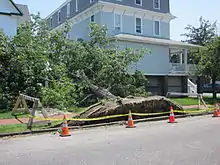 Damage was widespread and extensive along the entire path of the derecho, especially in northern Indiana and the Fort Wayne metro area, central and western Ohio, northeastern Kentucky, southwestern Pennsylvania, West Virginia, northern, central, and southwestern Virginia,[15] Maryland, Washington, D.C., Delaware and southern New Jersey. In all the mentioned areas, many trees uprooted or snapped, roofs became damaged, tents deployed to sell fireworks leading up to the 4th of July Holiday collapsed, and power outages were extensive, with over 4.2 million customers losing power as a result.[16] [17] An Appalachian Power representative described the power outage as the worst the company had ever seen.[15] In total, 22 people were killed across seven states and the District of Columbia.[18] At least ten of those deaths were in Virginia, all of them due to fallen trees.[15] Two of the deaths were in New Jersey, after two children were killed by falling trees at a campground at Parvin State Park, three deaths were reported in Maryland and one death was reported in Ohio after the storm.[19] As it occurred in the midst of the record Summer 2012 North American heat wave, conditions on following days were problematic, particularly for seniors and vulnerable people. Scattered structural damage also occurred along the path of the derecho, from both falling trees and the winds themselves. Some of the damage included siding was torn off houses, roofs removed from houses, businesses and apartment buildings, mobile homes heavily damaged, barns and garages destroyed and airplanes flipped.[7]