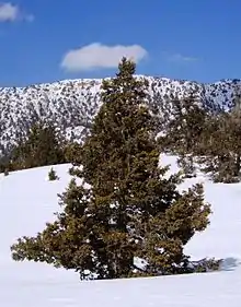 Juniperus seravschanica occurs in the higher-elevation forests in Kazakhstan, Kyrgyzstan, Tajikistan and Uzbekistan, which the World Wildlife Fund calls the 'Gissaro-Alai open woodlands'. In this general region Juniperus turkestanica, J. semiglobosa, maples (Acer spp.), almonds (Prunus amygdalus), and roses (Rosa spp.) also occur (although not necessarily in the same habitats).[3] In eastern Afghanistan it also occurs in upper-montane woodlands of J. seravschanica which occur between 3,100 and 3,300 meters, in the territory the WWF has delineated as 'East Afghan montane conifer forests',[4] and in the open xeric woodlands in between 1,500 and 2,000 meters elevation, in the geographic region further south in southern Afghanistan and Pakistan's Balochistan Province, which the WWF has named the 'Baluchistan xeric woodlands'.[5]