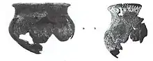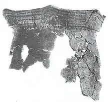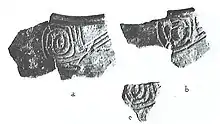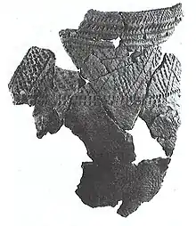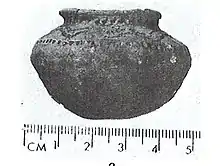 11 sherds representing a single vessel were present at Juntunen.[4] Ramey Incised is a Middle Mississippian pottery type first identified at the Cahokia Old Village site in southern Illinois. It has also been recovered at Carcajou Point in Wisconsin, but its presence at Juntunen marks the northernmost occurrence of any Middle Mississippian pottery type. Tempering is shell-tempered mixed with grit and decoration is a distinctive pattern of curvilinear designs. The vessel shape is thought to be a bowl with sharply defined shoulder. It was recovered in intermediate strata between the Bois Blanc and Juntunen Phases.[4][13]