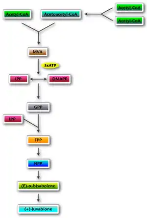 The transcription of sesquiterpene synthases was shown to begin on the third day following insect attack. Sesquiterpenoid JHAs continue to be produced up to twelve days later to prevent further insect reproduction.[5] The first sesquiterpene to be formed, (E)-α-bisabolene (formed by (E)-α-bisabolene synthase), can be further transformed into juvabione and todomatuic acid.[3][4]
