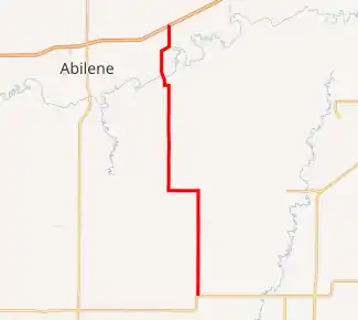 K-43 begins at an intersection with K-4 at the northern city limit of Hope. The highway heads north for about seven miles (11 km) before turning west and entering the small community of Navarre. The route crosses the BNSF Railway[3] and turns to the north, continuing through flat farmland. The highway crosses the railway again before entering the city of Enterprise. In Enterprise, K-43 turns east along 5th Street, then north onto Factory Street. The highway curves northwest and crosses the BNSF Railway a third time before crossing the Smoky Hill River on a 160-foot-long (49 m) truss bridge constructed in 1924.[4]