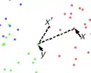 The border ratio is in the interval [0,1] because ||x'-y||never exceeds ||x-y||. This ordering gives preference to the borders of the classes for inclusion in the set of prototypes U. A point of a different label than x is called external to x. The calculation of the border ratio is illustrated by the figure on the right. The data points are labeled by colors: the initial point is x and its label is red. External points are blue and green. The closest to x external point is y. The closest to y red point is x' . The border ratio a(x) = ||x'-y|| / ||x-y||is the attribute of the initial point x.
