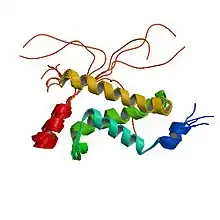 The KIX domain belongs to the proposed GACKIX domain superfamily. GACKIX comprises structurally and functionally highly homologous domains in related proteins. It is named after the protein GAL11 / ARC105 (MED15), the plant protein CBP-like, and the KIX domain from CBP and P300.[5] Additional instances include RECQL5 and related plant proteins.[6][7] All of these contain a KIX domain or KIX-related domain that interacts with the transactivation domain of many different transcription factors. The distinction between a KIX domain, a KIX-related domain and a GACKIX domain is subject to an ongoing debate and not clearly defined.
