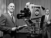 During the 1950s, channel 7's staff included newscaster (later sports anchor and Dialing for Dollars host) Starr Yelland, who came to the station from KOA-TV (channel 4, now KCNC-TV); weatherman Warren Chandler, and Ed Scott, who hosted a children's program on the station as "Sheriff Scotty".[17] In 1956, KLZ-TV presented the first remote television broadcast from a courtroom after general manager Hugh Terry won a court battle to allow cameras into the courtroom. In 1957, the station's weekly public affairs series Panorama (which was written and hosted by Gene Amole), became the first locally produced program in the Denver market to earn a Peabody Award (channel 7 has since won three more Peabody Awards for the investigative report "Honor and Betrayal: Scandal at the Air Force Academy" in 2003, reported by John Ferrugia and produced by Kurt Silver and current news director Jeff Harris,[18] 2008's "Failing the Children: Deadly Mistakes", reported by Ferrugia and produced by Tom Burke and Arthur Kane,[19] and 2012's "Investigating the Fire"[20]) Starting in 1968 and running through 1983, KLZ-TV aired one of the most popular children's programs in the Denver market, the Noell and Andy Show, which aired weekdays at 8:00 a.m. The program's coloring contest drew hundreds of entries each week.[17]