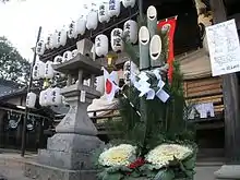 A kadomatsu (門松, "gate pine") is a traditional Japanese decoration as yorishiro of the New Year placed in pairs in front of homes to welcome ancestral spirits or kami of the harvest.[1]