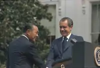 One of Tanaka's most remembered achievements is normalizing Japanese relations with the People's Republic of China, which occurred around the same time as Richard Nixon's efforts to do the same for Chinese relations with the United States.[6] In 1972, Tanaka met with Zhou Enlai of the People's Republic of China to discuss the normalization of relations between the two countries. Among other matters, they discussed the Senkaku Islands, which would later become a major point of contention between the two countries. Tanaka reportedly asked Zhou "What is your view on the Senkaku Islands? Some people say things about them to me," to which Zhou replied "I do not want to talk about it this time. If there wasn't oil, neither Taiwan nor the United States would make this an issue."[7] Just two months after taking office, Tanaka met Mao Zedong.[6]