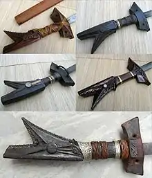 Similar weapons to the kampilan in the Philippines include the bangkung, laring, itak, pirah, and the banyal.[22][23][24] Other similar weapons to the kampilan outside of the Philippines include the Dayak mandau of Borneo;[25] the Minahasan santi of northern Sulawesi; and the Sangir pedang bara of the Sangihe Islands.[26]