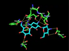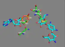 Aminoglycoside-3'-phosphotransferase (APH(3')), also known as aminoglycoside kinase, is an enzyme that primarily catalyzes the addition of phosphate from ATP to the 3'-hydroxyl group of a 4,6-disubstituted aminoglycoside, such as kanamycin.[2] However, APH(3') has also been found to phosphorylate at the 5'-hydroxyl group in 4,5-disubstituted aminoglycosides, which lack a 3'-hydroxyl group, and to diphosphorylate hydroxyl groups in aminoglycosides that have both 3'- and 5'-hydroxyl groups.[2][3] Primarily positively charged at biological conditions, aminoglycosides bind to the negatively charged backbone of nucleic acids to disrupt protein synthesis, effectively inhibiting bacterial cell growth.[4] APH(3') mediated phosphorylation of aminoglycosides effectively disrupts their mechanism of action, introducing a phosphate group that reduces their binding affinity due to steric hindrances and unfavorable electrostatic interactions.[5] APH(3') is primarily found in certain species of gram-positive bacteria.[6][7][8]