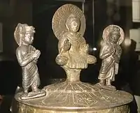 ![]() The "Kanishka casket", dated to 127 CE, with the Buddha surrounded by Brahma and Indra. Kanishka appears in the lower part among the scrolls, British Museum. | |