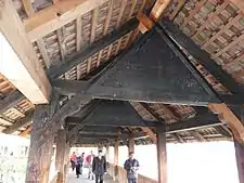 Lucerne is unique in that its three wooden pedestrian bridges, the 14th-century Hofbrücke (now destroyed) and Kapellbrücke and the 16th-century Spreuerbrücke, all featured painted interior triangular frames. None of Europe's other wooden footbridges have this feature.[8] The paintings, dating back to the 17th century and executed by local Catholic painter Hans Heinrich Wägmann, depict events from Lucerne's history. Of the original 158 paintings, 147 existed before the 1993 fire.[8] After the fire, the remains of 47 paintings were collected, but ultimately only 30 were fully restored.[8]