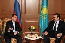 Massimov is considered a China expert.[14] China has become an important strategic partner for Kazakhstan in recent years and the two countries are working closely together to develop Kazakhstan's energy resources. Massimov visited Beijing, China with Finance Minister Natalya Korzhova, Transport and Communications Minister Serik Akhmetov, and Energy and Mineral Resources Minister Baktykozha Izmukhambetov from 16 to 17 November 2006. Massimov co-chaired the third meeting of the China-Kazakhstan Cooperation Committee with Chinese Vice Premier Wu Yi. Several accords between agencies of the two governments were signed.[15] Massimov later met with Chinese Prime Minister Wen Jiabao.[16] Meanwhile, Kazakh President Nursultan Nazarbayev met with Liu Qi, secretary of the Beijing Party Committee, in Astana. Secretary Liu said was "very nice for me to visit your beautiful country at Otan's invitation. The goal of the visit is to deepen cooperation and mutual understanding between our countries."[17]