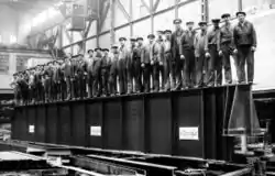 Like the surrounding area Slussen, named after the lock and built simultaneous to it in 1930–1935, the lock is a concrete construction resting on franki piles (e.g. cast-in-situ piles[3]) located along the sides of the canal and next to the gates. The base plate is made of reinforced concrete, reinforced with steel sleepers next to the gates. The walls of the canal are dressed in granite reinforced with vertical iron rebates stretching three meters from the bottom and horizontal anchoring irons. The two gates are sheeted with steel and lowered from the overhead road bridge, each of them operated with individual machinery hidden in the premises south of the canal. This sort of gates can be operated independent of water pressure, which makes additional aperture and culverts unnecessary for turning the lock.[4]