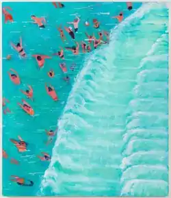 Bradford's later work (e.g., "Fear of Waves" show, 2016) has evolved toward larger, more vibrant work, that Yau writes "transform[s] the whimsical into the catastrophic, its polar opposite, without losing [its] offhand humor" and conveys a new gravitas.[60][61] Often painted in water-soluble acrylic—ideal for mimicking the effects of water in images of swimmers, bathers and surfers—these paintings take greater formal risks, with complex compositions of multiple figures and divided grounds of otherworldly, nocturnal planetary-oceanic environments.[62][61][63][60]