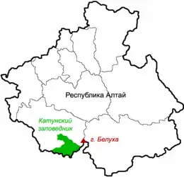 Katun Nature Reserve (Russian: Катунский заповедник) (also Katunsky) is a Russian zapovednik (strict nature reserve) located in the highlands of the central Altai Mountains of south Siberia. The Katun River runs down through a valley in the reserve, serving as the primary source of the Ob River. The headwaters of the Katun River originate on Mount Belukha, the highest mountain in Siberia at 4,506 metres (14,783 ft), which is located on the far eastern edge of the preserve. Katun is an internationally important center of biodiversity, forming part of the "Golden Mountains of Altai" UNESCO World Heritage Site. Katun Nature Reserve is situated in the Ust-Koksinsky District of Altai Republic.[1][2]