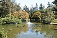 Campen and Renzel later approached the city to develop the Kelley property as a children's park in 1956, leading to the creation of Happy Hollow,[10] which opened in 1961, followed by the Japanese Friendship Garden (1965), Leininger Center (1966), and the Historical Museum (construction started in 1965). Only the 1910 house and a later carriage house remain from the Archer/Kelley family's time owning the property.[5] The 1910 estate house was damaged in a February 2012 fire, and portions of the roof and interior collapsed.[11]