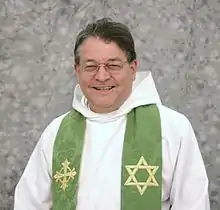 ![]() Portrait of Ken Howard, wearing a stole featuring both Christian and Jewish symbols. | |