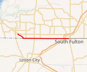 | Fulton–South Fulton line | 12.783 | 20.572 | West end of US 51 overlap (eastbound only); Kentucky–Tennessee line | ||