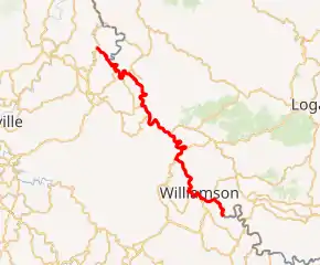 KY 292 begins at an intersection of Upper Stringtown Road and Stringtown Court southeast of Burnwell, within Pike County. It travels to the north-northwest, paralleling Tug Fork, and enters Burnwell. There, it passes McCoy Cemetery and crosses over Lower Stringtown Branch. It curves to the northeast and passes Phillips Cemetery before curving to the northwest. Then, it crosses over Maynard Branch. The highway then crosses over Buzzard Roost Hollow and curves to the southwest, where it enters Aflex. There, it crosses over Culler Hollow. It curves to the northwest and enters Goody, where it crosses over Pond Creek and intersects U.S. Route 119 (US 119). The two highways travel concurrently to the northwest and enter South Williamson. They intersect the southern terminus of KY 1506. When they split, KY 292 heads to the west-northwest. Then, it curves to the southwest. It crosses over Julius Branch and curves to the north-northwest. The highway curves to the west-southwest and passes Tug Valley ARH Regional Medical Center. It then intersects the eastern terminus of KY 612 (Turkey Creek Road). It crosses over Turkey Creek and curves to the northeast. The highway curves to the north-northwest and intersects Pennigton Drive, which leads to US 52 and US 119. After a crossing of Slater Branch, it curves to the northeast. During this curve, there is an interchange with US 52, but there is no access from KY 292 to the US highway. KY 292 travels under an overpass that carries US 52 and crosses over McCoy Branch. It curves to the northwest and then the west-northwest and travels under a second overpass that carries US 52. The highway crosses over Hurricane Branch and then curves to the north-northwest. It crosses over Negro Hollow. The highway curves to the west-northwest and intersects the northern terminus of KY 468. KY 292 turns right and heads to the north-northeast. It crosses over Big Creek, where it enters Martin County.[1]