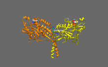 It has been previously known that kinesin move cargo towards the plus (+) end of a microtubule, also known as anterograde transport/orthograde transport.[29] However, it has been recently discovered that in budding yeast cells kinesin Cin8 (a member of the Kinesin-5 family) can move toward the minus end as well, or retrograde transport. This means, these unique yeast kinesin homotetramers have the novel ability to move bi-directionally.[30][31][32] Kinesin, so far, has only been shown to move toward the minus end when in a group, with motors sliding in the antiparallel direction in an attempt to separate microtubules.[33] This dual directionality has been observed in identical conditions where free Cin8 molecules move towards the minus end, but cross-linking Cin8 move toward the plus ends of each cross-linked microtubule. One specific study tested the speed at which Cin8 motors moved, their results yielded a range of about 25-55 nm/s, in the direction of the spindle poles.[34] On an individual basis it has been found that by varying ionic conditions Cin8 motors can become as fast as 380 nm/s.[34] It is suggested that the bidirectionality of yeast kinesin-5 motors such as Cin8 and Cut7 is a result of coupling with other Cin8 motors and helps to fulfill the role of dynein in budding yeast, as opposed to the human homologue of these motors, the plus directed Eg5.[35] This discovery in kinesin-14 family proteins (such as Drosophila melanogaster NCD, budding yeast KAR3, and Arabidopsis thaliana ATK5) allows kinesin to walk in the opposite direction, toward microtubule minus end.[36] This is not typical of kinesin, rather, an exception to the normal direction of movement.