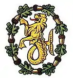 The fish–lion is also the centre feature in the borough's badge, but here it is surrounded by a garland of oakleaves as a reference to the rural nature of much of the district. Oak leaves are also a feature of the coronet in the crest of the former Downham Market Urban District Council.[23]