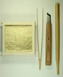 Kirikane (截金) is a Japanese decorative technique used for Buddhist statues and paintings, using gold leaf, silver leaf, platinum leaf cut into lines, diamonds and triangles.