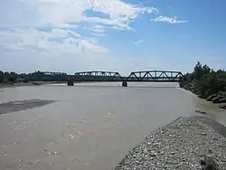 The Kodori (Georgian: კოდორი; Abkhazian: Кәыдры, romanized: Kwydry) is one of the two largest rivers of Abkhazia,[1] along with the Bzyb. It is formed by the joining of the rivers Sakeni and Gvandra. The Kodori is first among Abkhazia's rivers with respect to average annual discharge at 144 cubic metres per second (5,100 cu ft/s) and drainage basin area at 2,051 square kilometres (792 sq mi). It is second after the Bzyb with respect to length at 105 kilometres (65 mi) when combined with the Sak'en.[2]