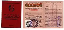 By 1925 Komsomol had 1 million members, and many others were in theater groups for younger children. In March 1926, Komsomol membership reached a NEP-period peak of 1,750,000 members: only 6 percent of the eligible youth population.[7] Only when Stalin came to power and abandoned the NEP in the first Five Year Plan (1928–1933) did membership increase drastically.[8] The youngest youth eligible for Komsomol membership were fourteen years old. The upper age-limit for ordinary personnel was twenty-eight, but Komsomol functionaries could be older. Younger children joined the allied Vladimir Lenin All-Union Pioneer Organization. While membership was nominally voluntary, those who failed to join had no access to officially sponsored holidays and found it very difficult (if not impossible) to pursue higher education.