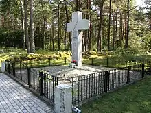 The commemorative monument erected in Koniuchy lists 38 names, among them 11 women and 15 children under the age of 16.[4] The youngest murdered child was 1.5-year old girl shot while held in her mother's arms.[34] Another dozen of villagers was injured.[4] According to reports of the Lithuanian Security Police, 36 houses, 40 granaries, 39 barns, and one banya were burned down, 50 cows, 16 horses, about 50 pigs, and 100 sheep were slaughtered.[4][16] By one account, only six houses remained standing in the village.[35] The same security police report also claimed that two murdered villagers were Lithuanian policemen and that one partisan was killed and three were injured – this is contradicted by Zimanas' reports that claimed no casualties on the Soviet side.[36] The surviving villagers received a government benefit of 500 Reichsmarks.[37]