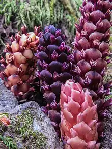 It is native to western North America from British Columbia to northern California, where it grows in wooded areas. It is a parasite of salal bushes, which it parasitizes by penetrating them with haustoria to tap nutrients. The groundcone is visible aboveground as a purplish, brown, or yellowish cone-shaped inflorescence 3 to 6 cm (1.2 to 2.4 in) long. Pale-colored flowers emerge from between the overlapping bracts. Coastal aboriginal groups ate the potato-like stembase of Ground Cones raw, though usually as a snack and not in any quantity.[5]