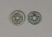 Coins issued by a government famine relief organisation named the "Stabilisation Office" (Sangpyeongchong 상평청, 常平廳) were introduced in 1633, the coins bear an abbreviation of the office's name with the phrase Tongbo (통보/"通寶" or circulating treasure) together formulating the inscription Sangpyeong Tongbo (상평통보, 常平通寶) which could be interpreted as "always even currency" and these first coins issued by the Sangpyeongchong had blank reverse sides.[4] The round shape of the cash coin represented the sky, and a square hole situated in the middle coin represented the earth.[3] The Sangpyeongchong served as a grain warehouse agency that would stockpile grain in years where the harvest was good, then in the years with less successful harvests the Sangpyeongchong would be able to distribute the stockpiled grains to prevent a major famine.[10]