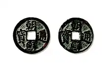 Cash coins were manufactured using a special casting technique where a Mother coin (母錢, 모전), or seed coin, was used that allowed for all coins in the same series to resemble each other with very little disparities between them.[11][12][13] The mother coin was initially prepared by engraving a pattern with the legend of the cash coin which had to be manufactured. In the manufacturing process mother coins were used to impress the design in moulds which were made from easily worked metals such as tin and these moulds were then placed in a rectangular frame made from pear wood filled with fine wet sand, possibly mixed with clay, and enhanced with either charcoal or coal dust to allow for the molten metal to smoothly flow through, this frame would act as a layer that separates the two parts of the coin moulds. The mother coin was recovered by the people who cast the coins and was placed on top of the second frame and the aforementioned process was repeated until fifteen layers of moulds had formed based on this single mother coin. After cooling down a "coin tree" (錢樹, 전수) or long metallic stick with the freshly minted cash coins attached in the shape of "branches" would be extracted from the mould and these coins could be broken off and if necessary had their square holes chiseled clean, after this the coins were placed on a long metal rod to simultaneously remove the rough edges for hundreds of coins and then these cash coins could be strung together and enter circulation.[14][15][16][17][18][19] Because of the way that the Sangpyeong Tongbo cash coins looked likes the leaves of a tree branch during this process, they were known as yeopjeon (葉錢) which could be translated as "leaf coin".[3][20]